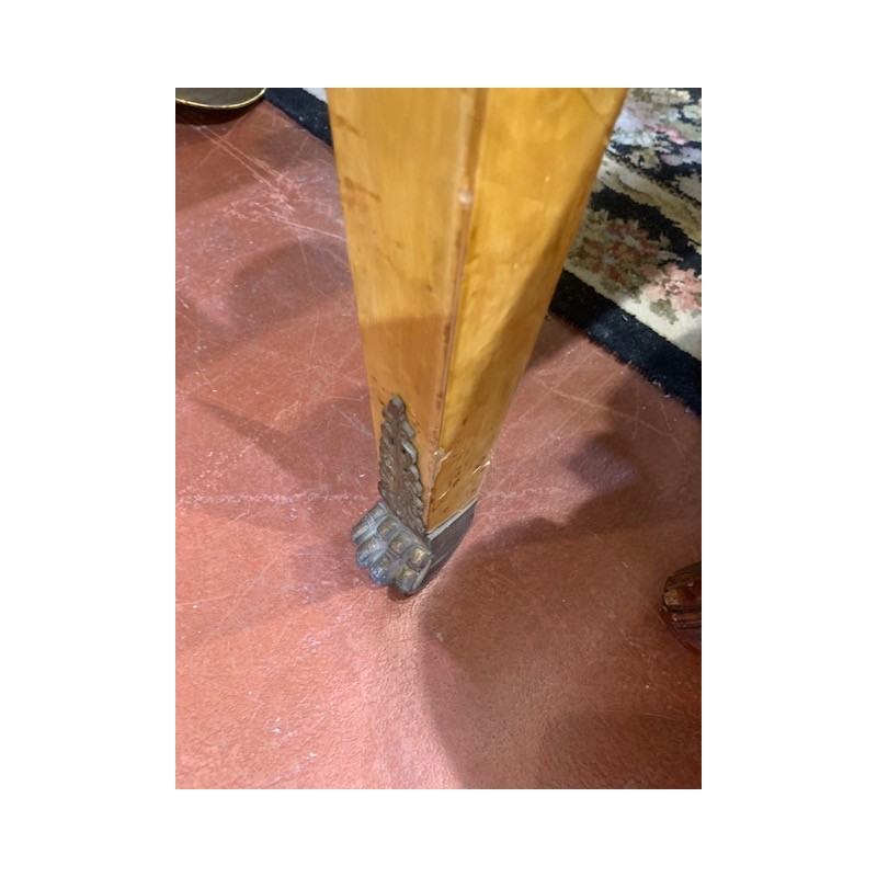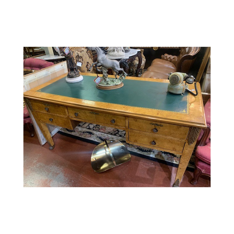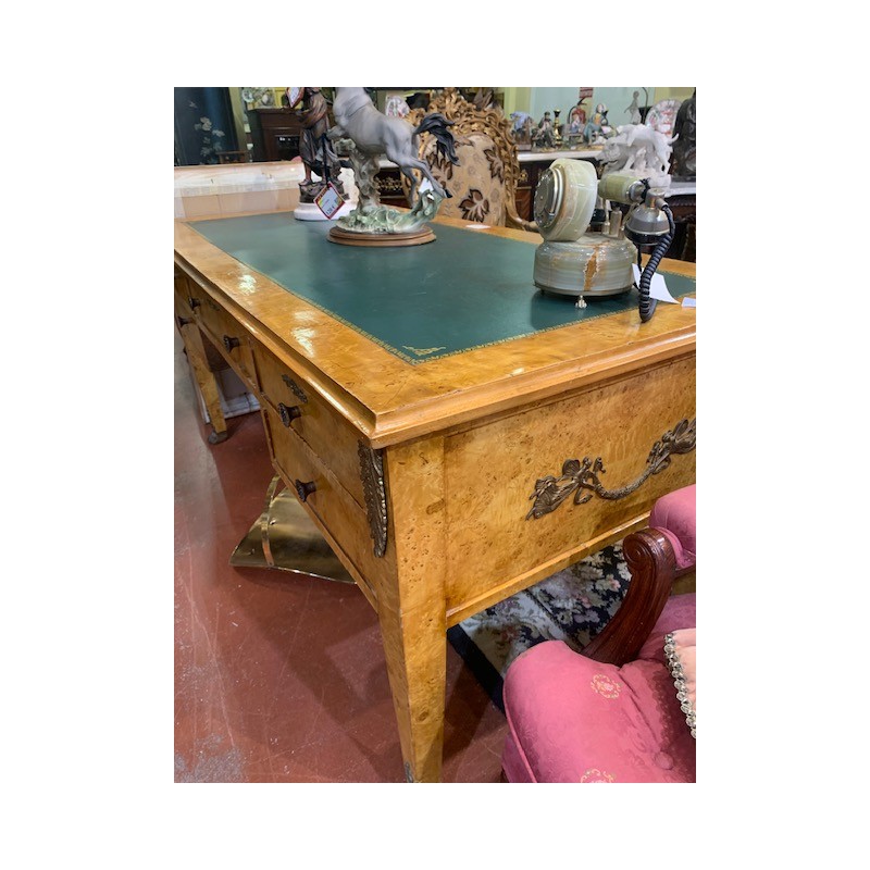 Mesa despacho estilo imperio con bronces sobre piel verde en madera raiz clara 165x78