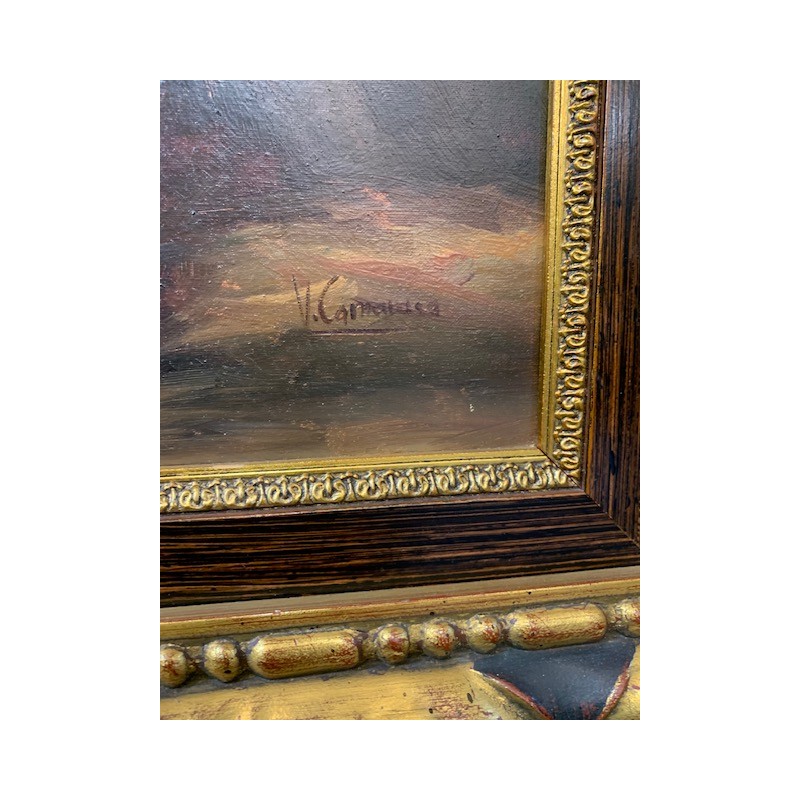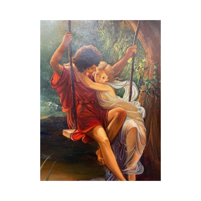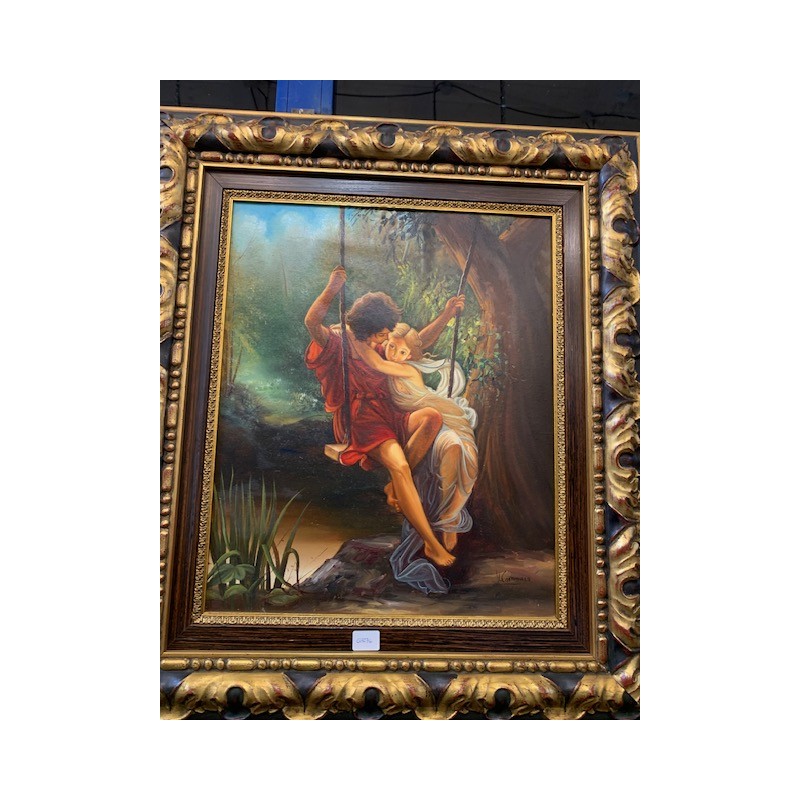 Oleo pareja en columpio firmado marco dorado envejecido