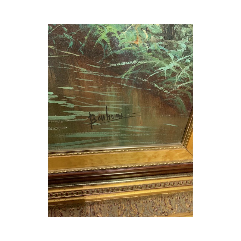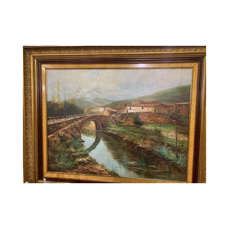 Oleo paisaje pueblo rio bajo puente firmado y enmarcado dorado 150x122
