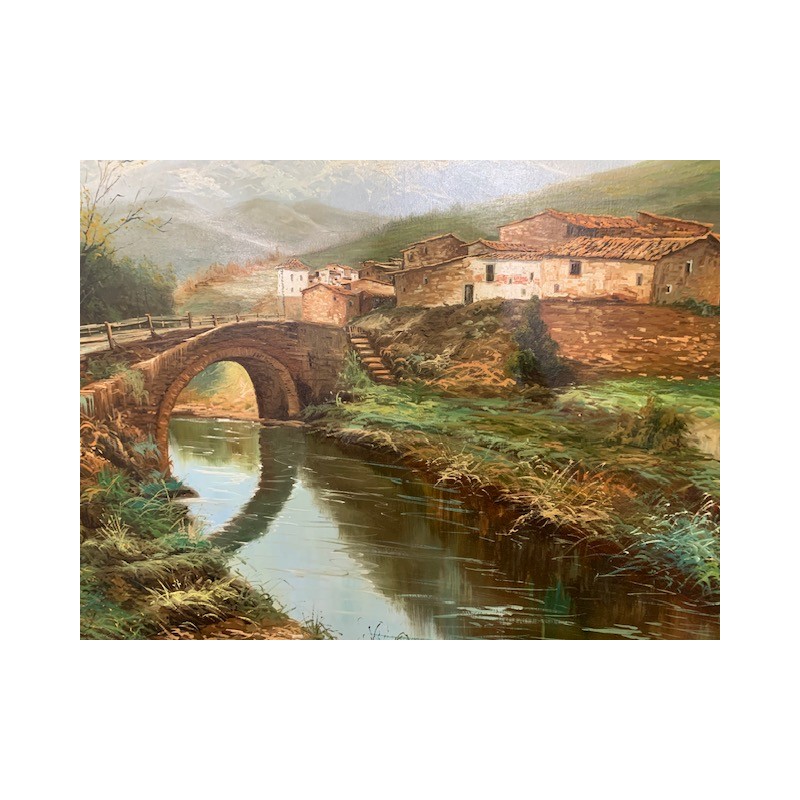 Oleo paisaje pueblo con rio bajo un puente firmado